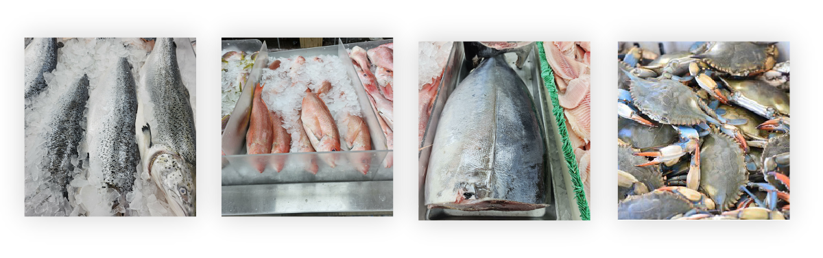 Red Snapper  Flounder Grouper Atlantic Salmon  Mahi Mahi Octopus  Sea Bass Crab Fingers  Catfish  Tuna Buffalo Carp Crawfish Meat Aligator Meat  Squid Frog Legs Oysters King Mackeral  Talapia  Crawfish Dungeness Crab
